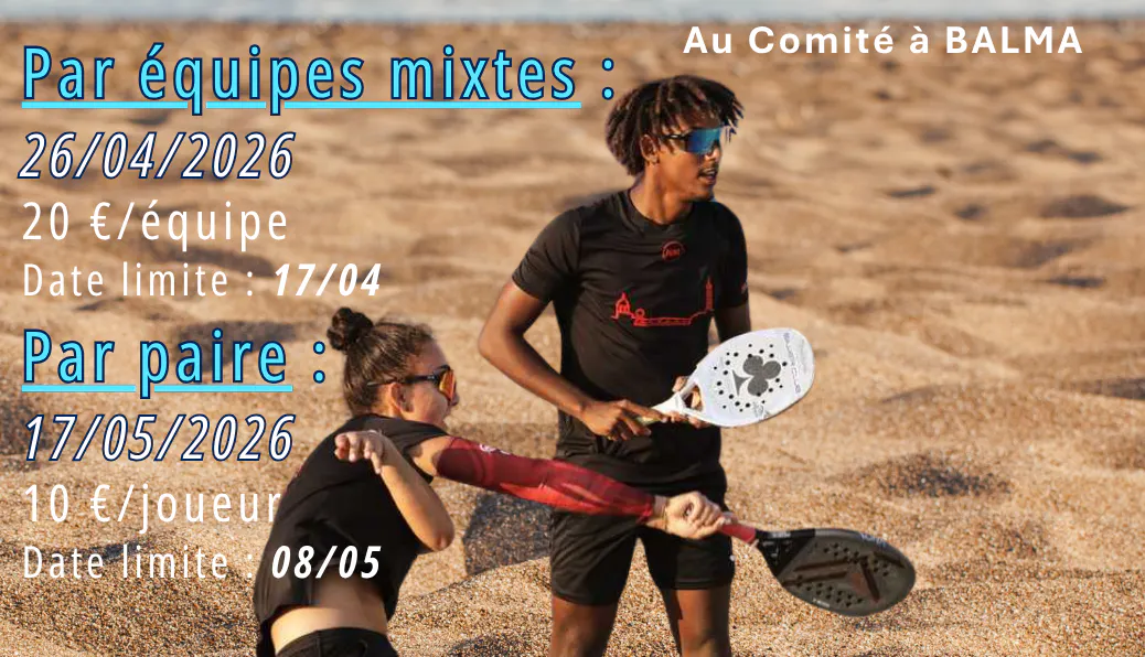 Le championnat départemental de beach tennis par équipes mixtes se jouera dimanche 26 avril 2026 au Comité départemental de tennis à Balma (3 av. Suzanne Lenglen, 31130 Balma).
