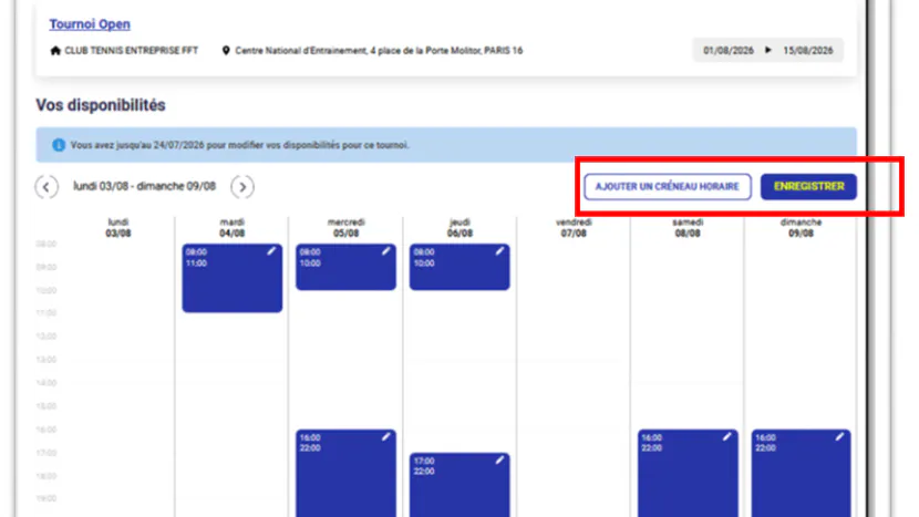 Depuis le 2 février 2025, les compétiteurs tennis peuvent consulter les disponibilités renseignées lors de leur inscription sur Ten’Up (Mes inscriptions tournois > Gérer mes disponibilités).
