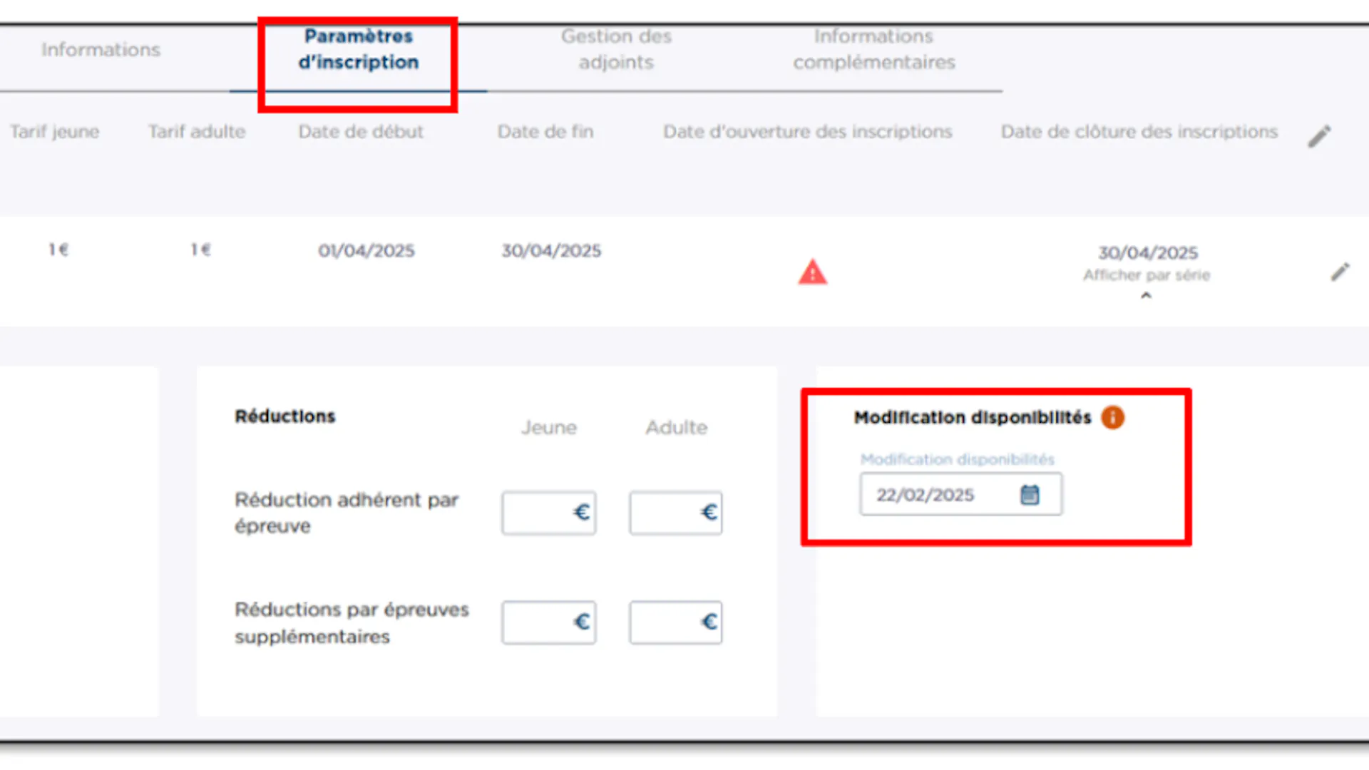 Lors de la création de l’homologation, la date limite de modification des disponibilités est fixée par défaut à J-7 avant le début de la compétition.